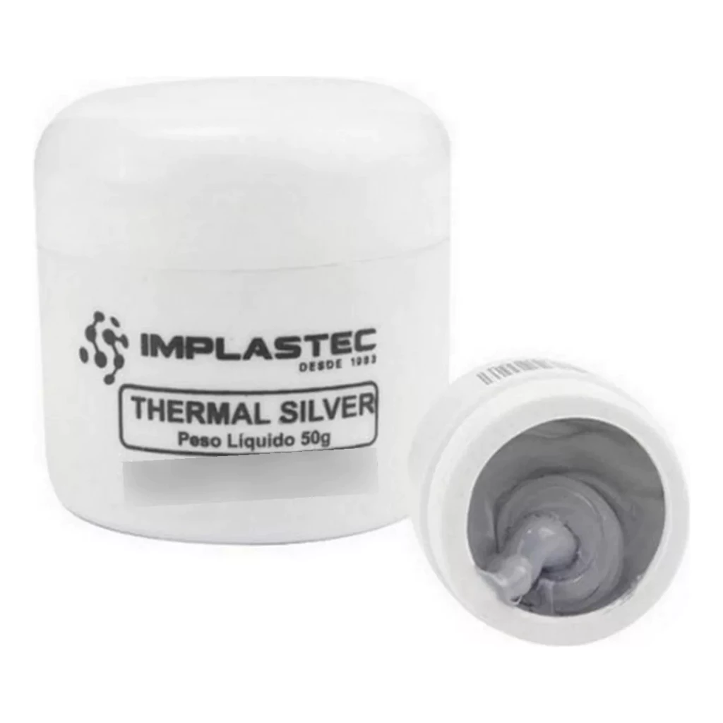 Pasta térmica Thermal Silver Prata de 50g, da Implastec, é um componente essencial para garantir a eficiência e a durabilidade dos processadores em sistemas de computação. Este produto é projetado especificamente para melhorar a condução de calor entre o processador (CPU) e o dissipador de calor, elementos críticos na manutenção de temperaturas operacionais seguras e no aumento do desempenho do sistema.